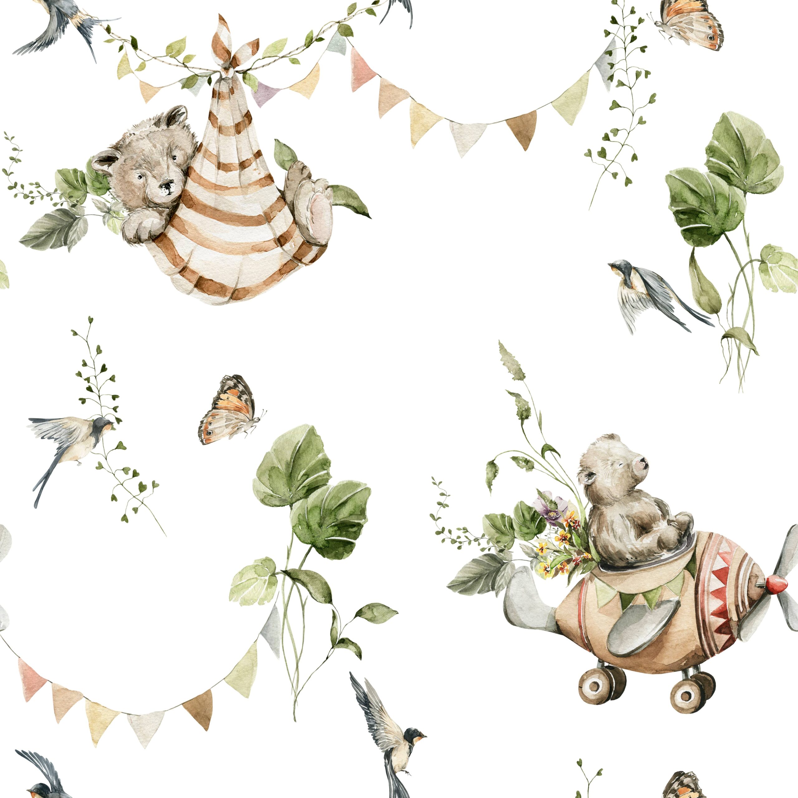 Grafika w stylu akwarelowym, utrzymana w zielonych, brązowych i pastelowych odcieniach, idealnie wpisuje się w dziecięcy świat wyobraźni — przedszkolny pokój, kącik zabaw, salę edukacyjną lub pokój malucha będzie dzięki temu tapetowaniu miejscem zarówno przytulnym, jak i inspirującym. Styl pełen przyjaznej ekspresji i miękkich form — doskonały dla miłośników natury, nauki i fantazji.